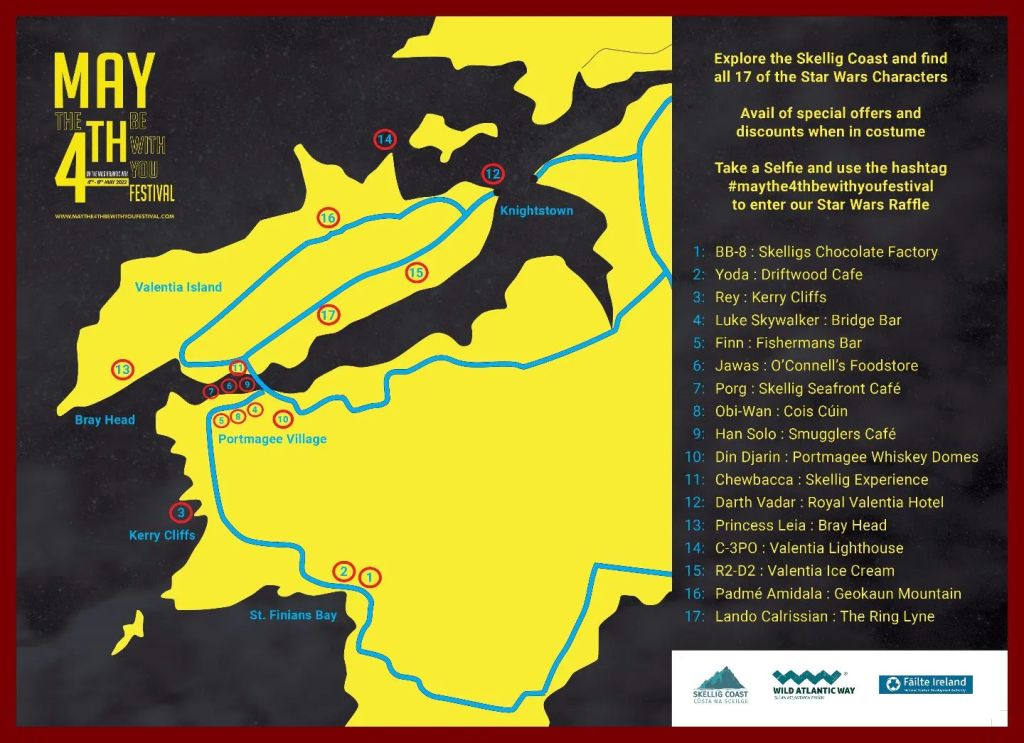 Enfin, à Portmagee, dans le port d’attache des navettes fluviales qui partent faire la visite de l’Île de Skellig Michael, un rendez-vous annuel organisé le 04 Mai pour le Star Wars Day rassemble les fans du pays puis est devenu un festival de films de science-fiction sur un weekend.