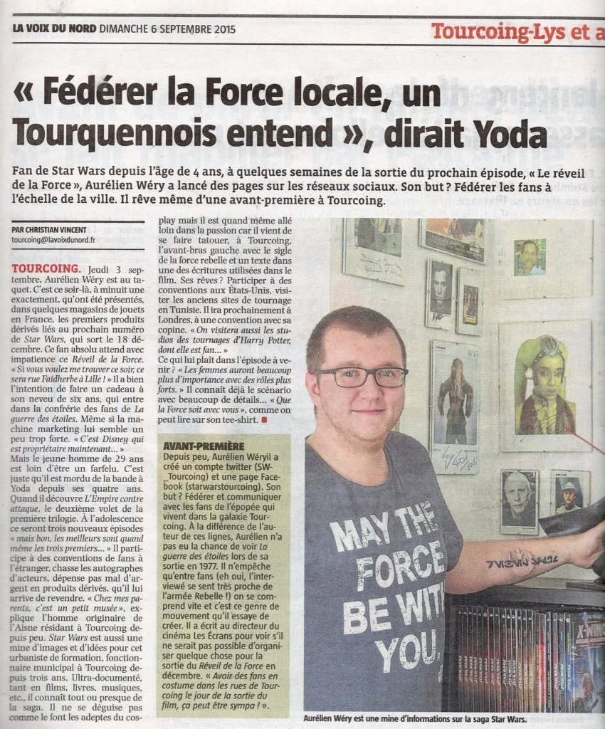 Dans le cadre de la sortie évènement de l’Episode VII (2015) et parce que je suis tout de même actif sur les réseaux sociaux, la presse locale s’intéresse à ma passion et je fais l’objet de quelques apparitions dans le journal Voix du Nord / Nord-Eclair. J’ouvre également une page Facebook et un compte Twitter pour marquer l’évènement et réunir les fans locaux sur les réseaux sociaux. Je suis invité à participer aux avant-premières des nouveaux films au Grand Rex à Paris et en 2016 je me rends à Londres pour ma première Star Wars Celebration, le plus grand évènement mondial où les annonces et acteurs s’enchainent sur les différentes scènes de l’Excel London. Je réitérerai d’ailleurs l’expérience londonienne quelques années plus tard (2023). Ce weekend à Londres m’aura aussi permis de découvrir les Studios Harry Potter de Leavesden, lieu où fut tourné la Menace Fantôme !