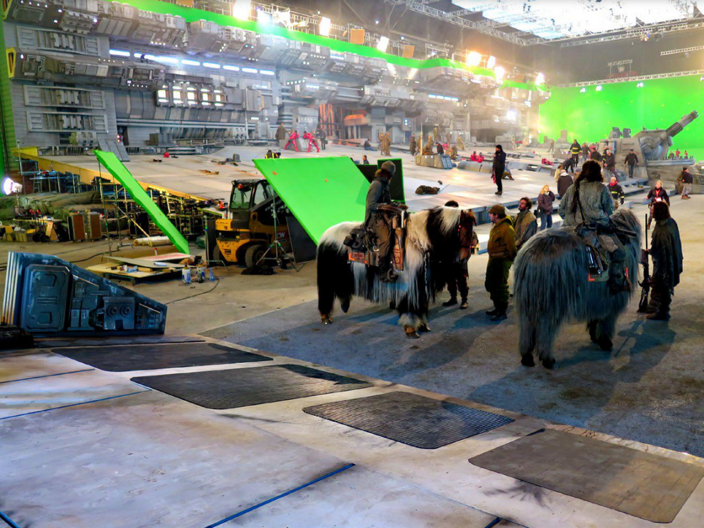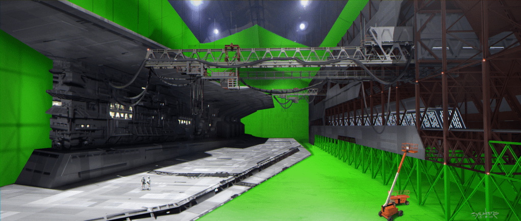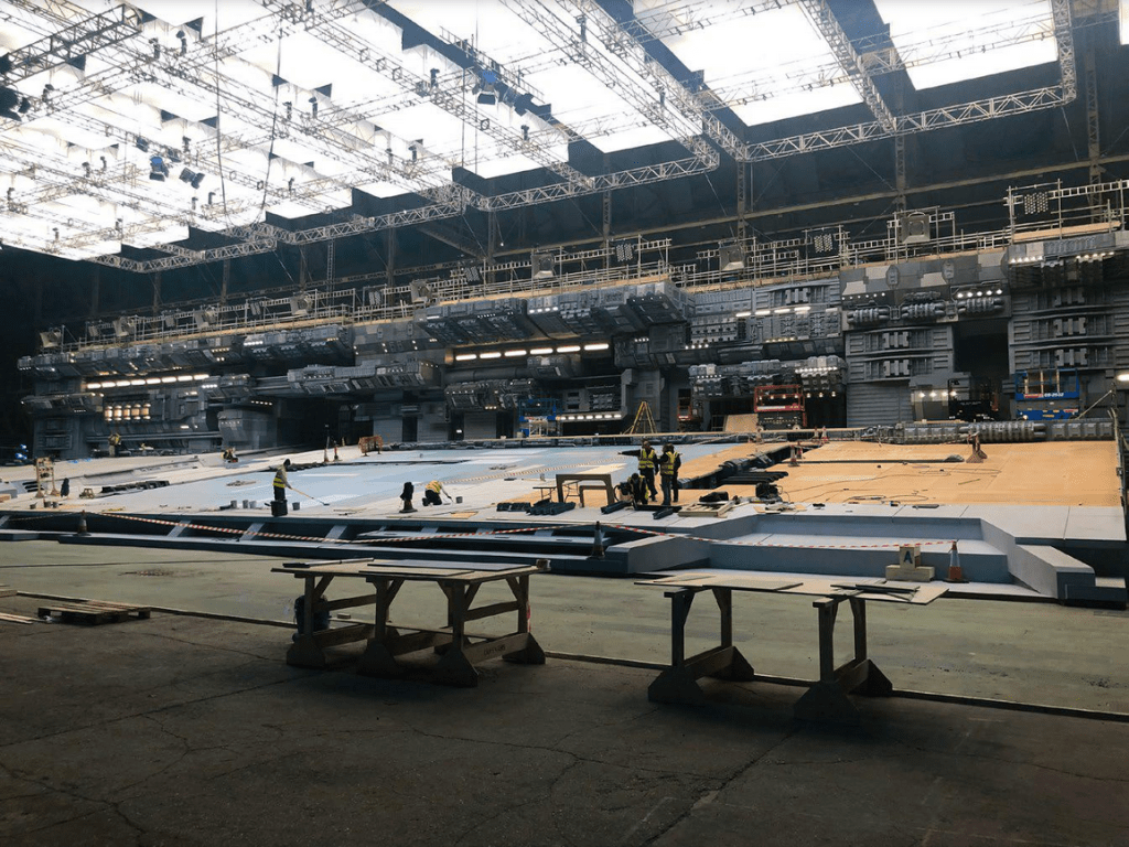 Un des artistes conceptuels du film, Phil Saunders, avait expliquĂ© sur le site Arstation la difficultĂ© de construire un tel plateau qui devait ĂȘtre totalement plat (pour la sĂ©curitĂ© des animaux) avec tous ces dĂ©tails d’une part mais en incluant aussi l’idĂ©e que les ponts des vaisseaux Destroyers sont lĂ©gĂšrement inclinĂ©s Ă l’Ă©cran. Voici un concept-art de 2017 et son insertion virtuelle dans les hangars de Cardington.