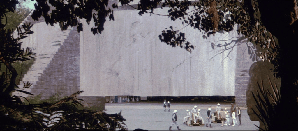 Cet unique plan tournĂ© Ă Cardington pour l’Episode IV : Un Nouvel Espoir est d’ailleurs trĂšs fortement inspirĂ© d’un dessin de Ralph McQuarrie, gĂ©nial illustrateur de la saga. La premiĂšre version du film avant la retouche de 1997 est d’ailleurs davantage fidĂšle au design initial rendant le temple plus brut et moins dĂ©taillĂ©, McQuarrie Ă©tant Ă©galement l’auteur de la matte-painting utilisĂ©e dans la premiĂšre version du film.