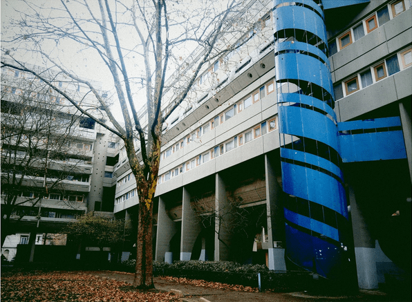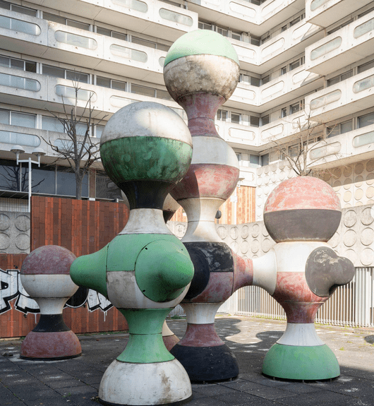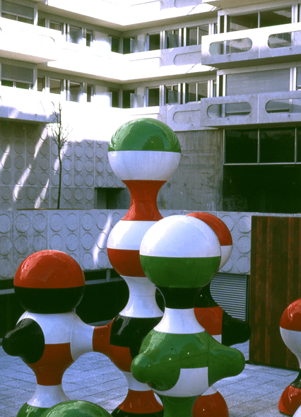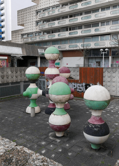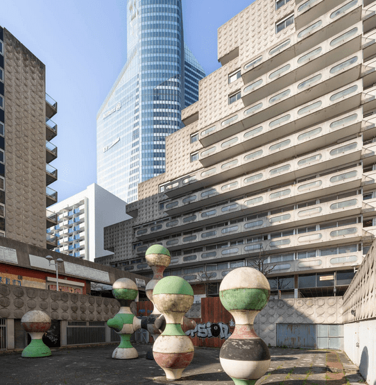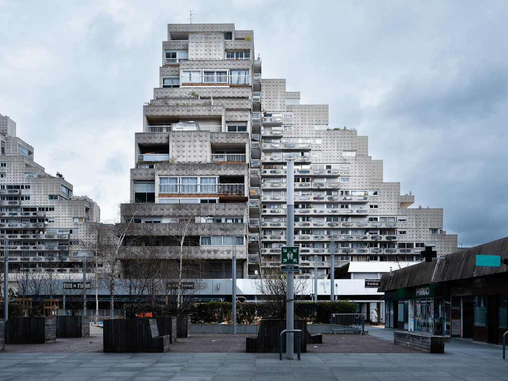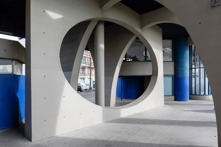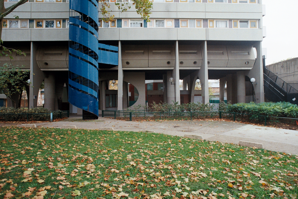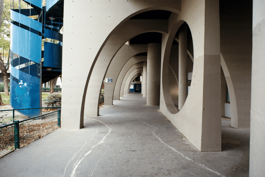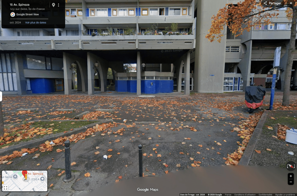 Il s’agit d’une photographie prise à Ivry-sur-Seine, aux pieds d’une résidence de l’Ensemble Spinoza (dans la rue du même nom), située aux abords de l’Hôtel de Ville et bâtie entre 1966 et 1973. C’est l’architecte Renée Gailhoustet, célèbre pour ses réalisations de grands ensembles de logements sociaux en banlieue parisienne, qui a imaginé cet espace de béton et où les percées pour la déambulation des piétons sont multiples au travers des bâtiments et mènent aussi bien à la rue qu’au centre de l’îlot qui forme un jardin public.