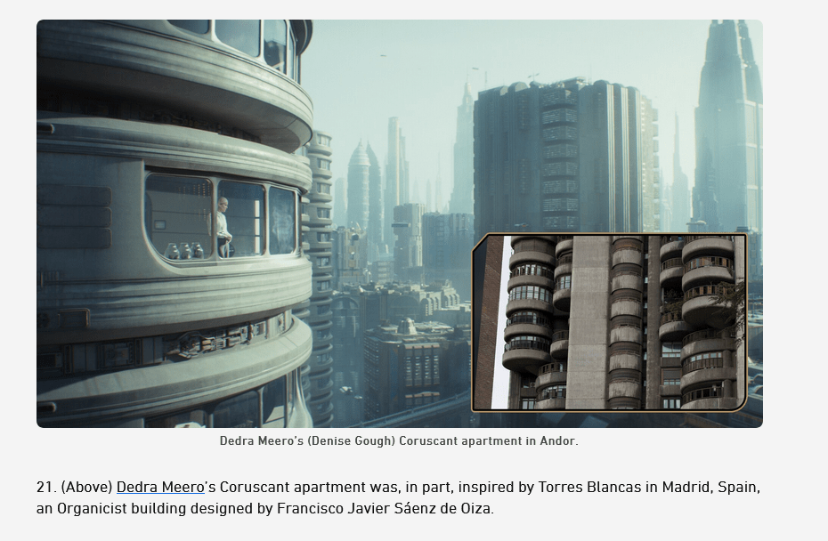 Il s’agit des Tours Blanches (Torres Blancas) de Madrid, un ensemble de logements dans une tour à dominante cylindrique et organique, brutaliste (évidemment) et créée par l’architecte Francisco Javier Sáenz de Oiza en 1969. Leur forme caractéristique a été utilisée pour représenter à l’écran le logement de Dedra Meero sur la planète Coruscant.
