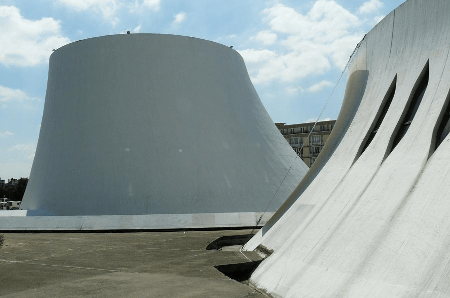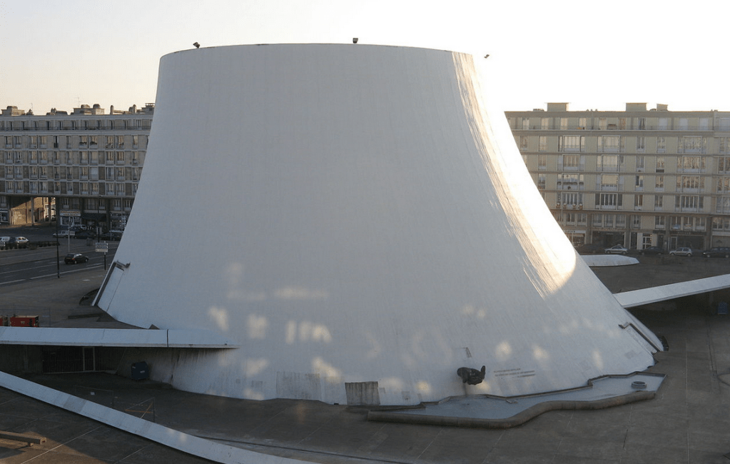 Quelques recherches par photo inversée m’amènent à trouver qu’il s’agit ni plus ni moins du fameux Volcan du Havre, dans le centre-ville classé à l’UNESCO en 2005 ! La première « maison de la culture » de France y fut inaugurée en 1982 et aujourd’hui, c’est un centre culturel avec une salle de spectacle (théâtre, musique, danse, cirque, arts numériques…) et un lieu d’exposition. La structure est l’œuvre du célèbre architecte brésilien Oscar Niemeyer à qui l’on doit entre autres la construction de Brasilia, la nouvelle capitale décentralisée du Brésil dans les années 60. Mais, et ce n’est sans doute pas un hasard pour Luke Hull, on lui doit également le siège du parti Communiste Français à Paris à qui l’on prête, tout au moins pour son aspect intérieur, de fortes ressemblances avec le siège du BSI dans la première saison d’Andor.